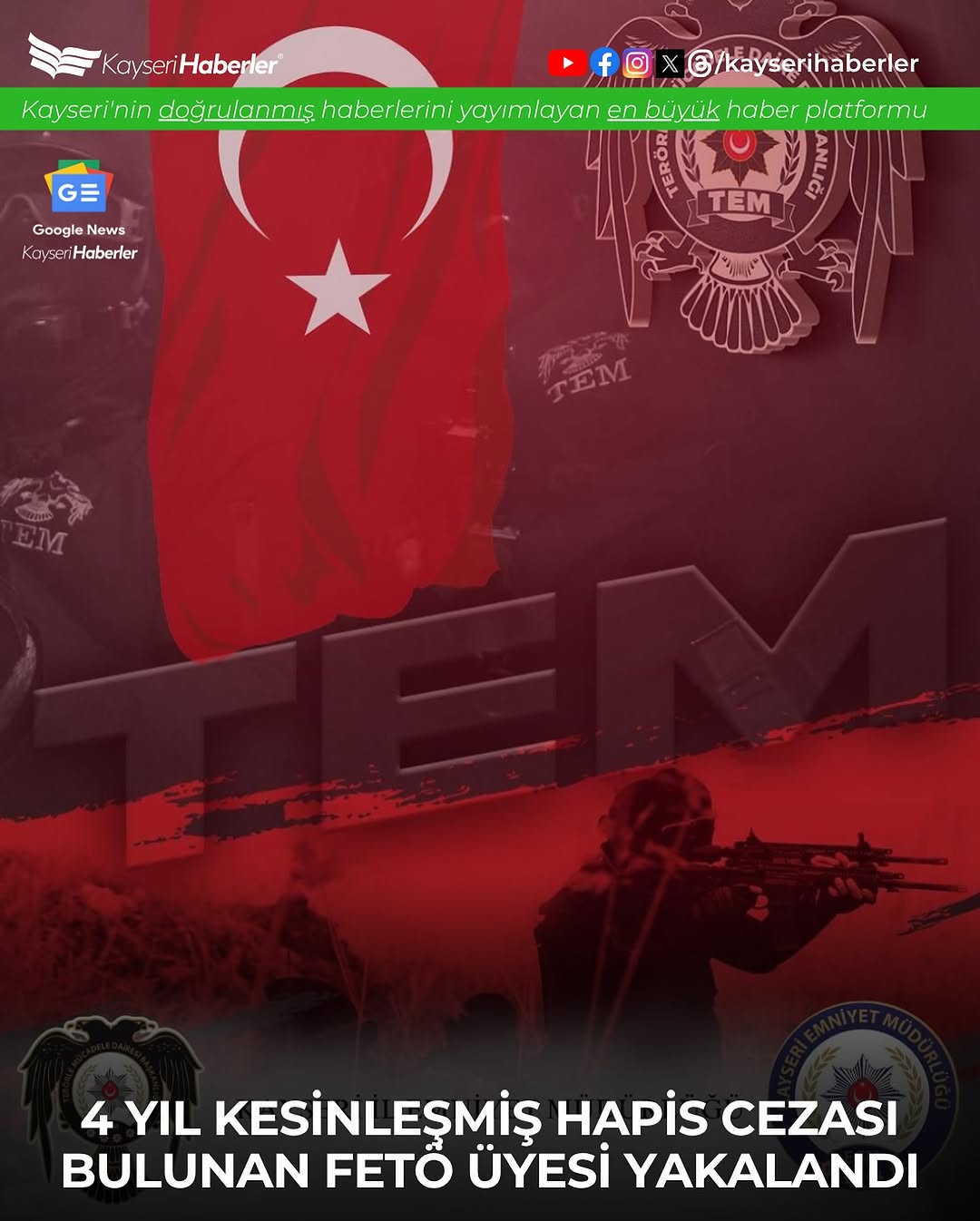 Kayseri'de düzenlenen bir operasyonda, FETÖ/PYD silahlı terör örgütüne üye olma suçundan kesinleşmiş hapis cezası bulunan bir şahıs yakalandı.