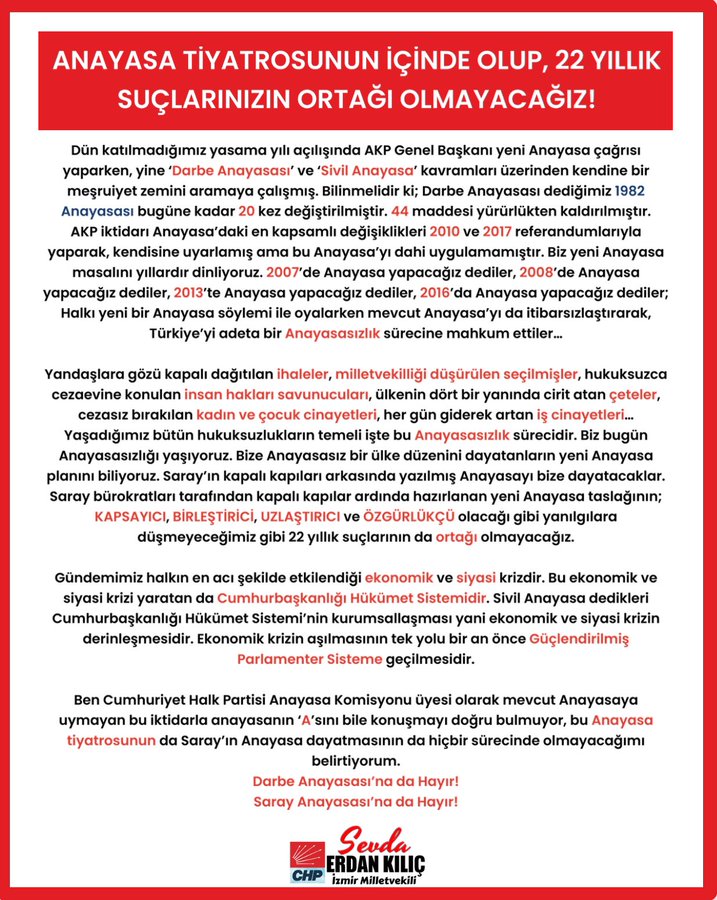 Cumhuriyet Halk Partisi (CHP) İzmir Milletvekili Sevda Erdan Kılıç, katılmadığı yasama yılı açılışında yapılan yeni Anayasa çağrısını eleştirdi. Kılıç, AKP Genel Başkanı’nın “Darbe Anayasası” ve “Sivil Anayasa” kavramları üzerinden meşruiyet arayışında bulunduğunu belirtti.