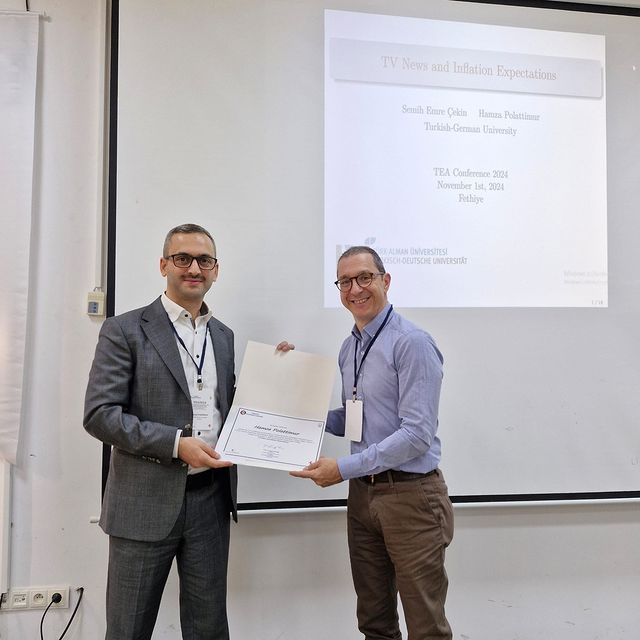 Türkiye Ekonomi Kurumu tarafından düzenlenen 31. İktisat Konferansı olan TEA Conference 2024'te, Türk-Alman Üniversitesi İktisat Bölümü'nden önemli bir katılım gerçekleşti. Dr. Öğr. Üyesi Hamza Polattimur, 31 Ekim - 2 Kasım 2024 tarihleri arasında Fethiye'de düzenlenen bu önemli etkinlikte yer aldı. İktisat Bölümü'nden meslektaşı Doç. Dr. Semih Emre Çekin ile birlikte hazırladıkları "TV News and Inflation Expectations" başlıklı çalışmayı katılımcılarla paylaştı.