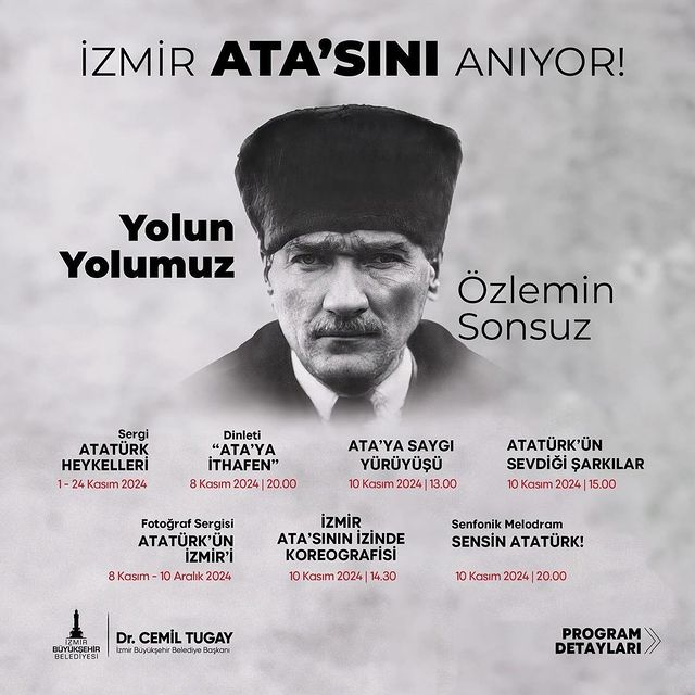 Güllü'nün Kızı Tuğyan Ülkem Gülter, Tasarlayarak Kasten Öldürme Suçundan Hakimliğe Sevk Edildiİzmir Büyükşehir Belediyesi tarafından düzenlenen anma programı, dinletiler, sergiler, yürüyüşler ve özel koreografilerle zenginleştirilecek. Etkinlikler, Atatürk'ün anısını yaşatmak ve ona olan saygıyı ifade etmek amacıyla gerçekleştirilecek. Tüm yurttaşların katılımıyla gerçekleştirilecek bu etkinlikler, İzmir'in dört bir yanında düzenlenecek ve katılımcılarla dolu bir atmosfer oluşturulması hedefleniyor. Bu özel günde tüm İzmirlileri Atatürk'ü anma programına davet eden belediye, katılan herkese tercihlerine uygun etkinliklerde yer alma imkanı sunacak. Amacın, Atatürk'ün hatırasını onurlandırmak olduğu ifade ediliyor.