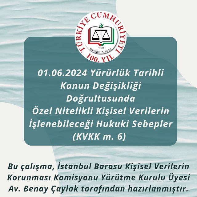 İstanbul Barosu Kamuya Açık Veri Koruma Komisyonu, 01.06.2024 tarihli kanun değişikliğinin ardından özel nitelikli kişisel verilerin işlenebilmesi için hukuki sebeplerle ilgili bir infografik çalışması hazırladı. Bu çalışmanın fikir babası ve uygulayıcısı olarak görev alan Komisyon üyesi Benay Çaylak'a teşekkür edildi.
