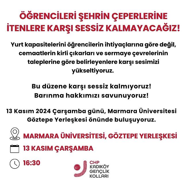 Gençler, 13 Kasım 2024 Çarşamba günü Marmara Üniversitesi Göztepe Kampüsü önünde gerçekleştirilecek olan buluşmaya davet ediyor. "Barınma hakkı, insanca yaşamın temelidir!" diyerek, eşit, nitelikli ve parasız yurt talebinde bulunduklarını haykırmak için bir araya gelmek istiyorlar.