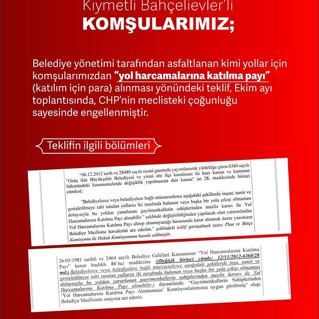 Kıymetli Bahçelievler’li komşularımız, belediye yönetiminin bazı yolların asfaltlanması için komşularından "yol harcamalarına katılma payı" talep edilmesi önerisi, Ekim ayı meclis toplantısında gündeme geldi. Ancak CHP'nin meclisteki çoğunluğunun yanı sıra diğer muhalefet gruplarının da desteğiyle, bu ücretin komşulardan istenmeyeceği kararlaştırıldı. Böylece vatandaşların ekonomik yükleri hafifletilmiş oldu.
