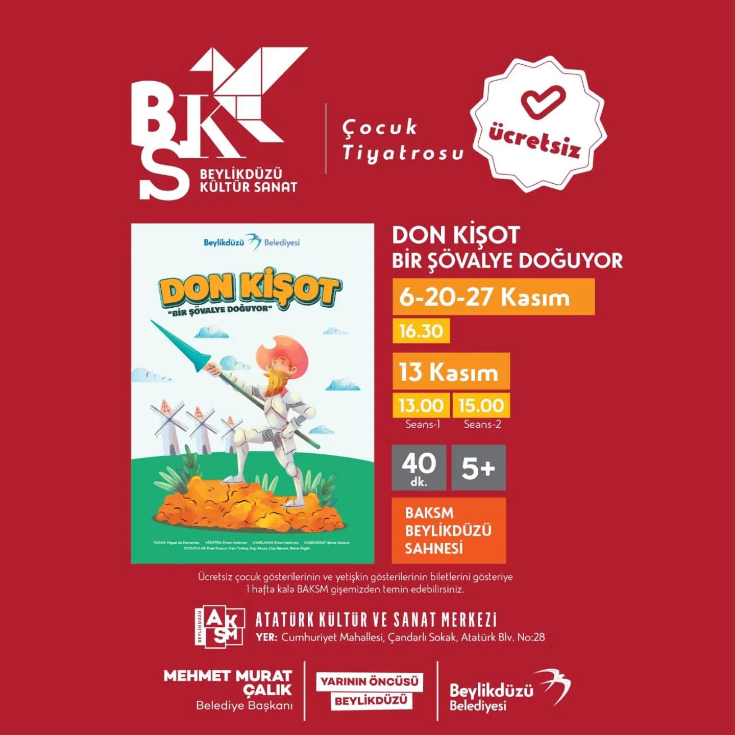Beylikdüzü’nde Sanat Etkinliği: Sanatçılar için Yarışmaların ÖnemiBeylikdüzü Sahnesi, Kasım ayında çocuk tiyatrosu oyununa ev sahipliği yapacak. "Don Kişot Bir Şövalye Doğuyor" adlı tiyatro oyunu, 13, 20 ve 27 Kasım tarihlerinde sahnelenecek. Etkinlik, kültürel katkı sağlamak amacıyla düzenleniyor ve tüm vatandaşların katılımına açık. Aileler, çocukları ile birlikte keyifli zaman geçirmek için bu gösterilere katılarak sanatla buluşma fırsatını değerlendirebilirler. Beylikdüzü Belediyesi, çocukların sanatla tanışmasını destekleme amacıyla bu tür organizasyonlara önem vermeye devam ediyor.