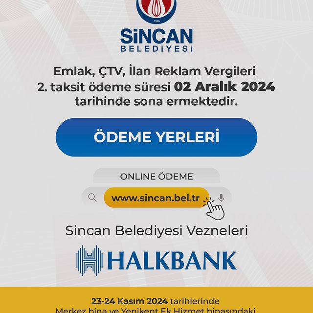 Güllü'nün Kızı Tuğyan Ülkem Gülter, Tasarlayarak Kasten Öldürme Suçundan Hakimliğe Sevk EdildiSincan Belediyesi, emlak, çevre temizlik ve ilan reklam vergileri için son ödeme tarihini 2 Aralık 2024 olarak belirledi. Vergi mükellefleri, belirtilen vergilerin 2. taksit ödemelerini bu tarihe kadar gerçekleştirmeleri gerekmektedir. Vergi ödemeleri, Halkbank şubeleri ve vezneleri aracılığıyla ya da Sincan Belediyesi'nin resmi web sitesi üzerinden yapılabilmektedir. Time zamanında ödeme yapan mükelleflere hatırlatma yapılmaktadır. Ayrıca, 23-24 Kasım tarihlerinde Merkez Bina ve Yenikent Ek Hizmet Binası'ndaki vezneler, sabah 09:00'dan akşam 16:00'ya kadar hizmet vermektedir. Mükellefler, bu tarihlerde vezneleri kullanarak ödemelerini gerçekleştirebilir.