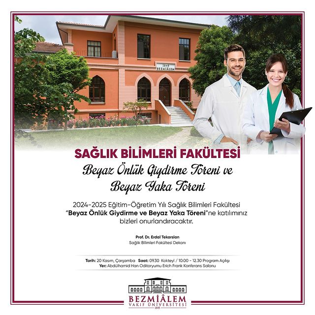 Sağlık Bilimleri Fakültesi öğrencileri, meslek hayatlarına ilk adımlarını atmaya hazırlanıyor. Beyaz yaka ve beyaz önlüklerini giyerek sağlık alanına olan bağlılıklarını simgeleyecekleri Beyaz Önlük Töreni, 20 Kasım Çarşamba günü saat 10:00'da Erich Frank Konferans Salonu'nda gerçekleştirilecek.