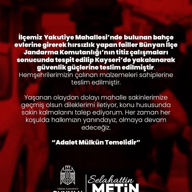 Bünyan İlçe Jandarma Komutanlığı, hırsızlık faillerini titiz çalışmalarıyla tespit ederek, Kayseri sınırları içinde yakaladı. Olayla ilgili yapılan soruşturma sonucunda çalınan eşyalar sahiplerine geri teslim edildi.