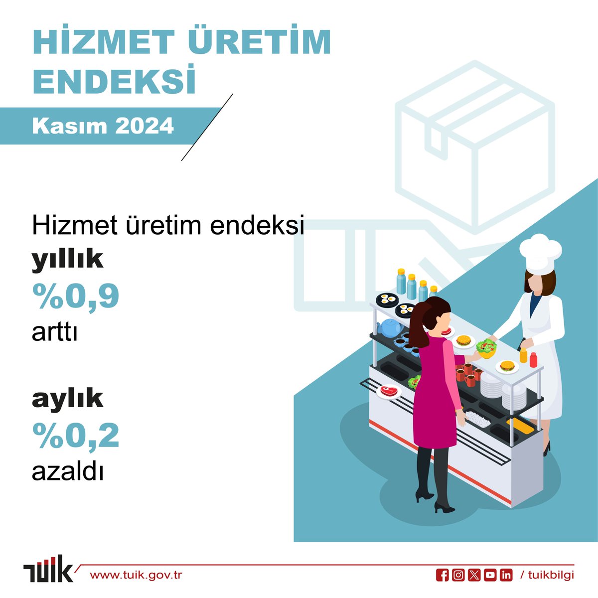 Kasım 2024 itibarıyla Türkiye'de hizmet üretim endeksi bir önceki yılın aynı ayına göre %0,9 oranında bir artış gösterdi. Bu artış, hizmet sektöründeki büyümenin devam ettiğine işaret ediyor.