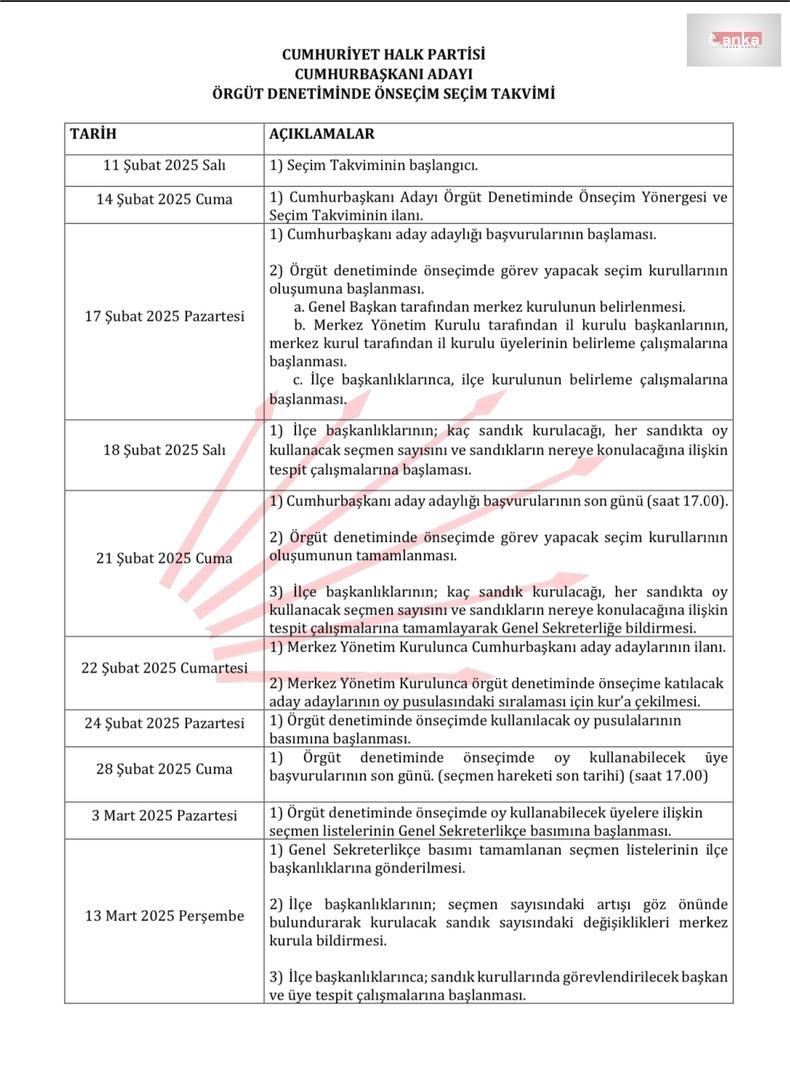 Cumhuriyet Halk Partisi (CHP), cumhurbaşkanı adayını belirlemek için ön seçim takvimini kamuoyuyla paylaştı. 23 Mart tarihinde gerçekleştirilecek olan ön seçimler, partinin adayı belirleme sürecinde önemli bir adım olarak öne çıkıyor.