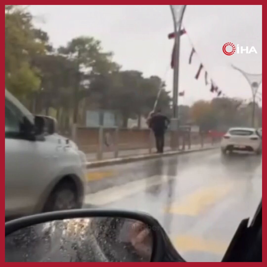 Olay, kentte havanın aniden bozması ve sağanak yağışın başlamasıyla gerçekleşti. Şiddetli rüzgar, bazı binalara ve direklere asılı Türk bayraklarının sökülüp yere düşmesine neden oldu. Bu sırada bir vatandaş, ıslanmayı göze alarak düşmek üzere olan veya yere inmiş bayrakları toplamak için harekete geçti.