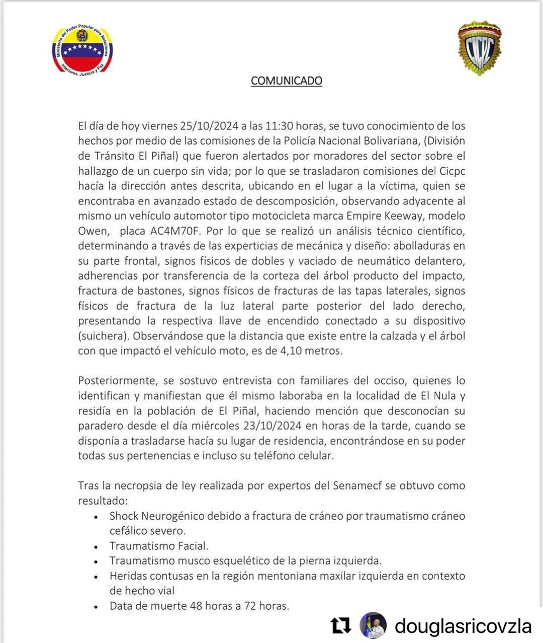 Bugün, Venezuela Táchira eyaletinde 36 yaşındaki Edwin Alexander Santos Quinonez'in ölümüne ilişkin açıklama yapıldı. Quinonez, Voluntad Popular partisinin bir siyasi aktivistiydi ve karayolu kazası sonucu hayatını kaybetti. Olay, El Nula yolunda, Arenosa Köprüsü yakınında gerçekleşti; motosikletinin bir ağaca çarpması sonucunda Quinonez’in olay yerinde yaşamını yitirdiği bildirildi. Bu üzücü olay, tüm ülkede derin bir üzüntü yaratmıştır. Yetkililer, bu trajik olayla ilgili olarak bazı medya organları ve kişilerin hükümeti hedef alan yanlış bilgilendirmeler yaptığını belirtti. İçişleri, Adalet ve Barış Bakanlığı'nın talimatları doğrultusunda, bu yanlış haberlere neden olan kişiler hakkında bir soruşturma başlatılacağı vurgulandı. Ülkenin huzurunu ve güvenliğini sağlamak adına, devlete karşı çıkan ve kamuoyunu yanıltmaya yönelik aktarımların önüne geçilecektir. #EdwinAlexanderSantosQuinonez #VoluntadPopularPartisi #Táchira #Venezuela #trafikKazası #hükümet #soruşturma
