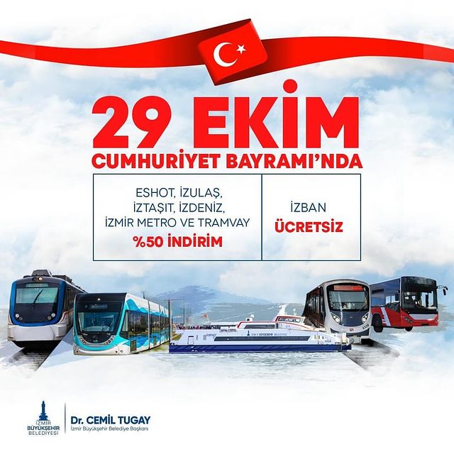 Güllü'nün Kızı Tuğyan Ülkem Gülter, Tasarlayarak Kasten Öldürme Suçundan Hakimliğe Sevk Edildiİzmir Büyükşehir Belediyesi, Cumhuriyet Bayramı dolayısıyla toplu ulaşımda önemli bir duyuruda bulundu. 29 Ekim tarihinde İZBAN tren hattı ücretsiz olarak hizmet verecek. Toplu taşıma araçları da indirimli olarak kullanılabilecek. Diğer toplu taşıma araçlarında ise yolcular, %50 indirimli ulaşım imkanından faydalanabilecek. Bu uygulama ile hem ulaşım kolaylığı sağlanıyor hem de Cumhuriyet Bayramı'nın coşkusu artırılıyor. İzmirlilere özel bu fırsatların değerlendirilmesi, bayram neşesinin daha fazla hissedilmesine olanak tanıyacak.